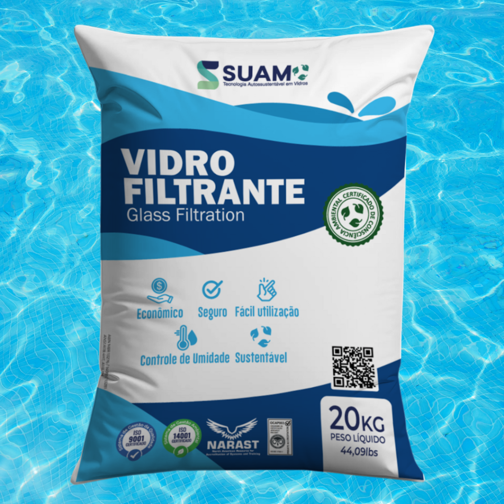 O vidro filtrante é uma alternativa moderna à areia tradicional, garantindo maior poder de filtração e água mais limpa ao reter partículas muito pequenas. Além de melhorar a qualidade da água, ele reduz o consumo de água e energia nas retrolavagens, pois necessita de menos lavagens e mantém sua eficiência por mais tempo.